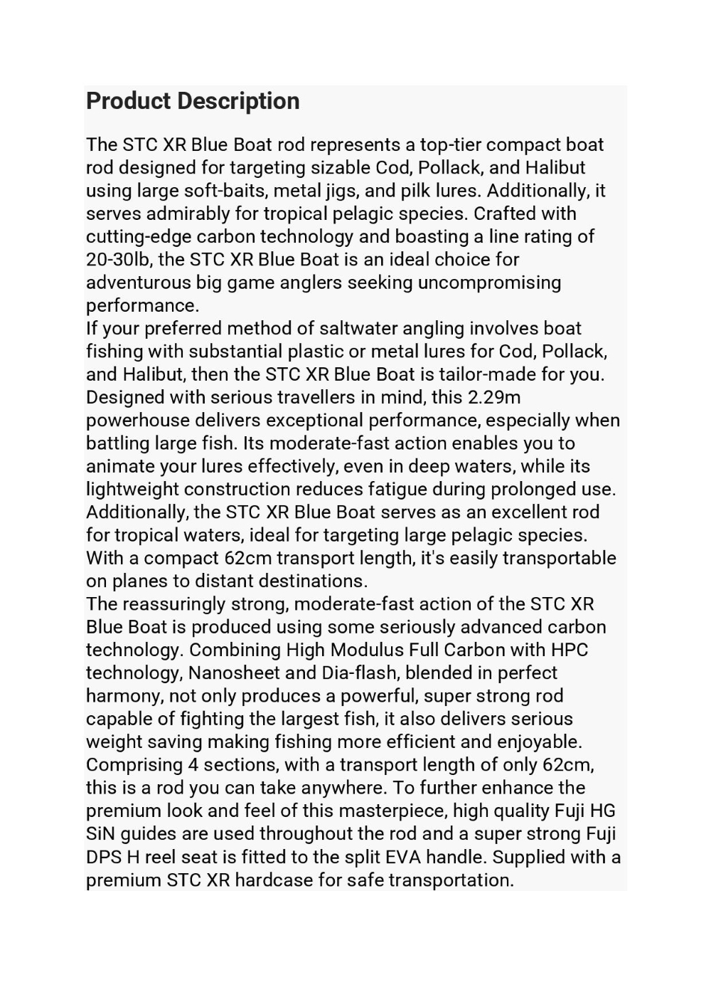 Full Carbon + Nano Sheet + Biofibre Blank with Extra Fast action. Imense power and strength ideal for SW Big game fish. Fuji DPS Reel Seat with EVA handle. Twin leg Shimano Hardlite Guides for additional strength. A multi-Length rod for extra versatility.