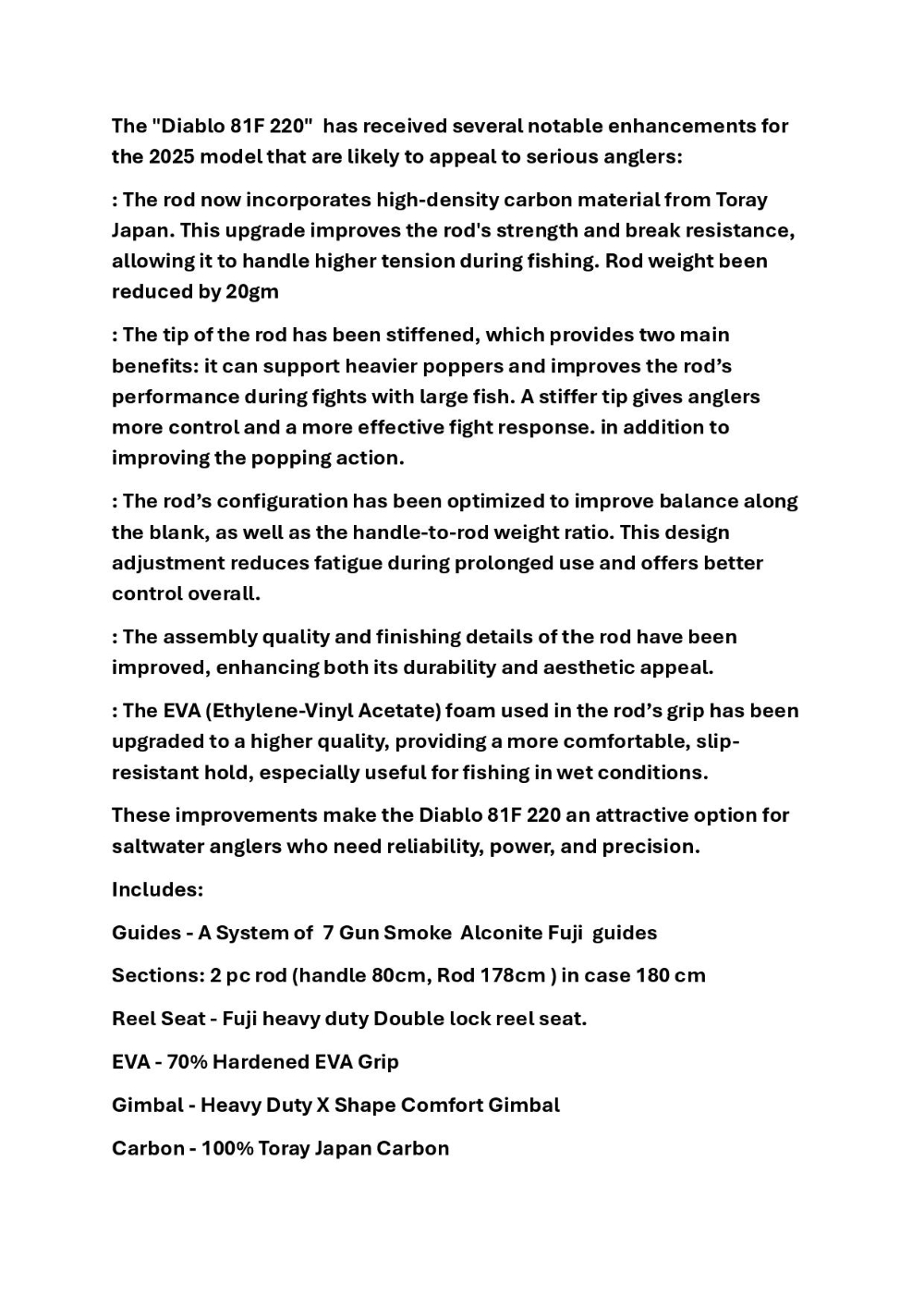 A Hybrid Rod for Stickbaits 80 to 150g and Poppers 90 to 130g. length 256cm, 2pc Butt section. Closed length 173cm. Weight 406g. Fuji SIC Alconite Guides and HD Double Lock Reel Seat.