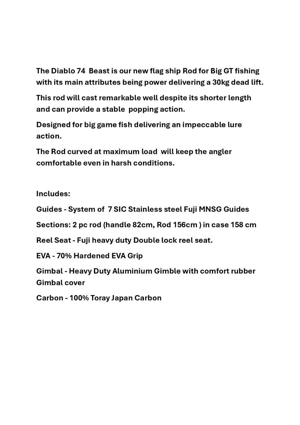 7`4", 2pc Butt section. Weight 410g. SIC MNSG guides, HD Reel Seat, Gimble